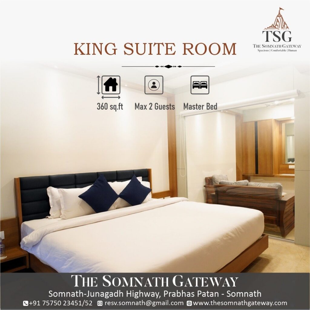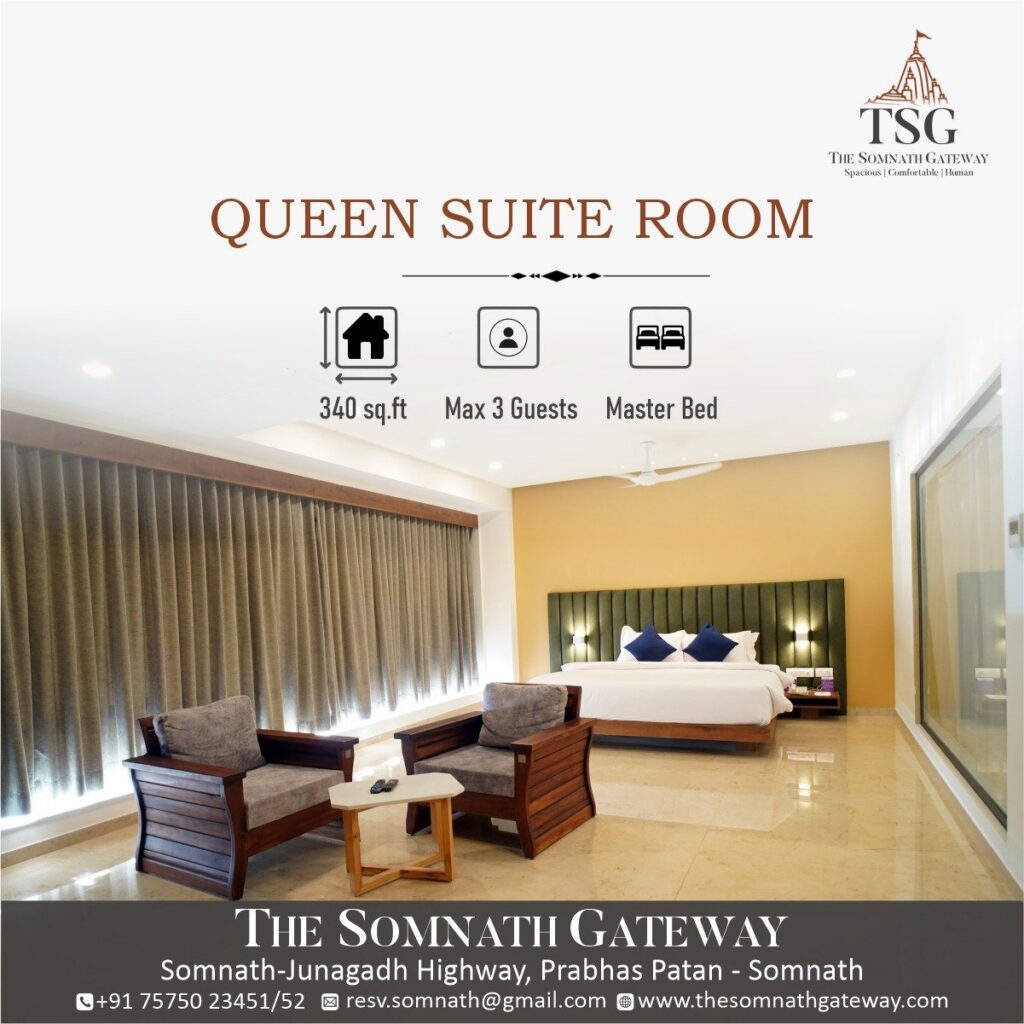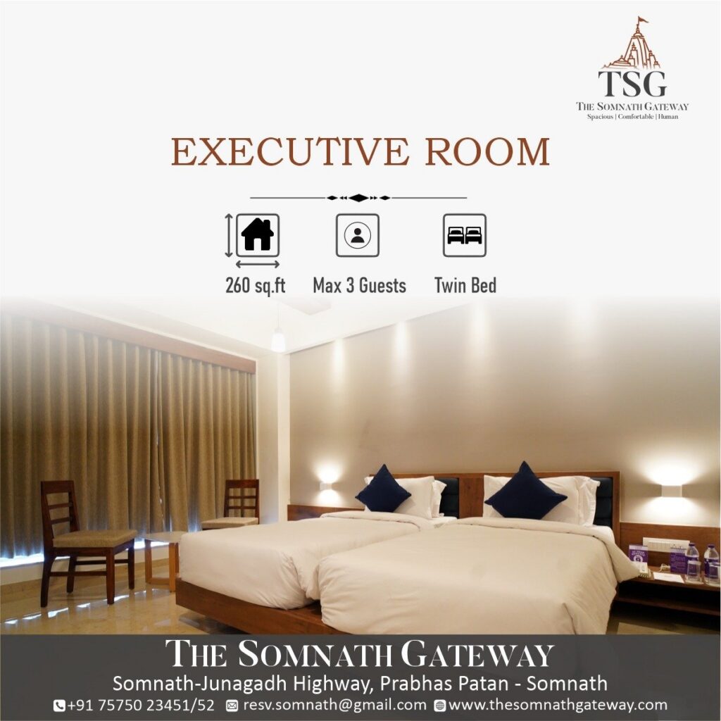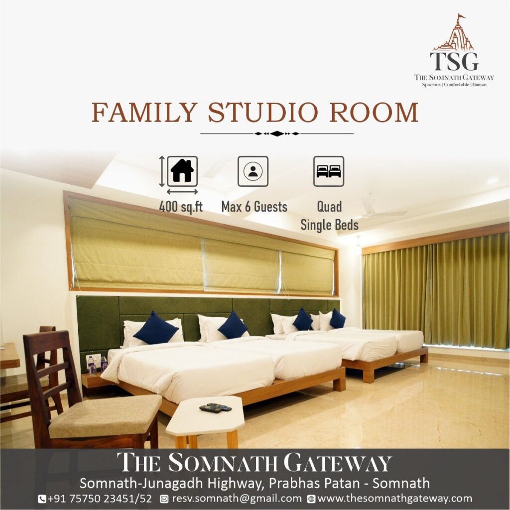 The Somnath Gateway is a proudly independent hotel on the Somnath–Junagadh Highway, Prabhas Patan — just 2 km from the sacred Somnath Jyotirlinga and right behind Somnath Railway Station.